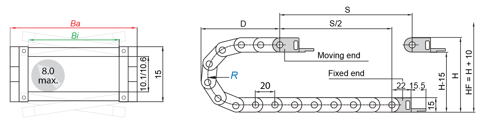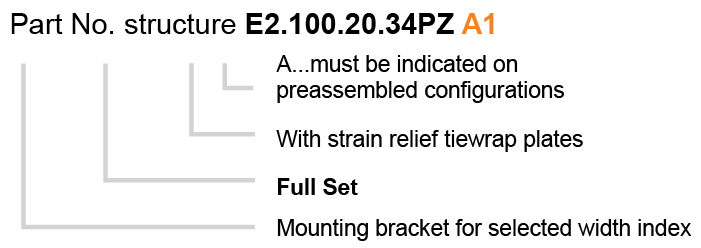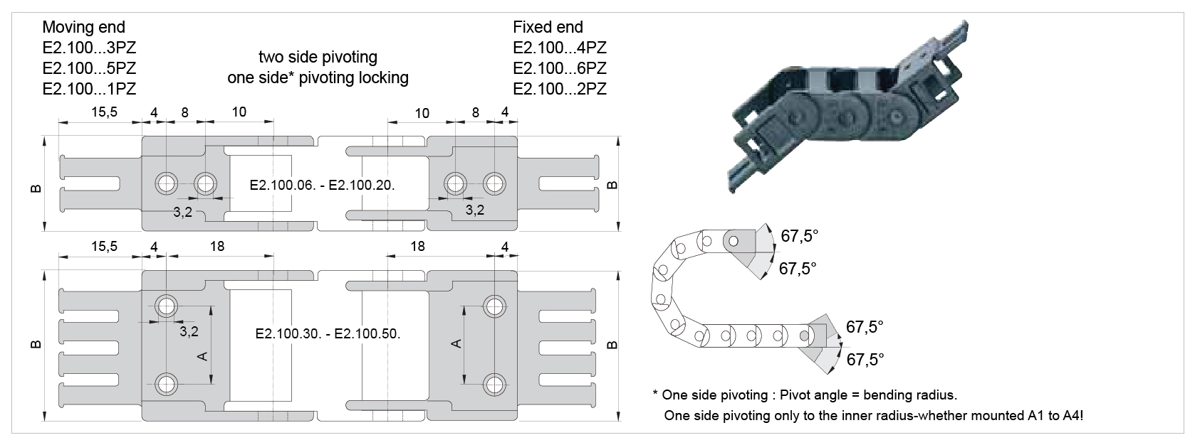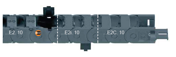 Snap-open along outer radius | Snap-open along inner radius | One-piece, non snap-open | Bi(mm) | Ba(mm) | R Bending Radii(mm) | E2.10(kg/m) | E2i.10(kg/m) | E2C.10(kg/m) |